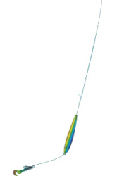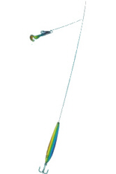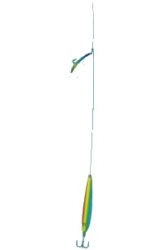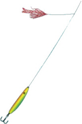 Jigging-Montage Im Ostseebereich total „in“. Der Drilling des Pilkers wird entfernt und ein je nach Bedingungen 30-80 cm langer Seitenarm an der unteren Öse befestigt. Ein zweiter Seitenarm oberhalb des Pilkers ist optional. Der Pilker dient hier nur als Gewicht und Lockköder. |