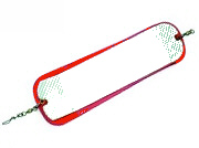 Dodger | Lockblech für das Tiefenschleppen. Läßt sich leicht selbst herstellen. Blank oder farbig, soll Köder ohne nennenswerte Eigenbewegungen seitlich pendeln lassen. Köder werden 0,5 bis 1 m nachlaufend montiert. |