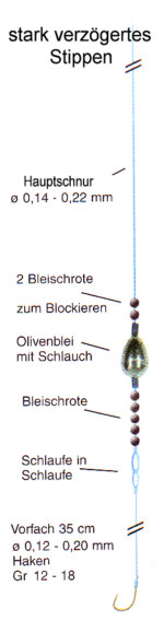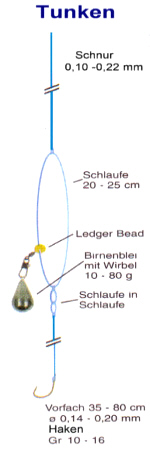 Bei dieser Methode fischt man mit einer Pose, die als Bißanzeiger unter der Rutenspitze hängend, eingesetzt wird. Der Vorteil dabei ist, dass die Pose der Strömung entzogen wird. Damit ist auch nicht die Tragkraft der Pose entscheidend. Je kleiner die Pose, umso weniger Windwiderstand. Die Montage wird ruhig auf den Punkt abgesetzt. Es ist ein schweres Blei zu wählen, damit der Köder ruhig auf dem Boden liegt. Um das Blei entsprechend wechseln zu können, empfiehlt es sich mit einem Birnenblei zu arbeiten. |